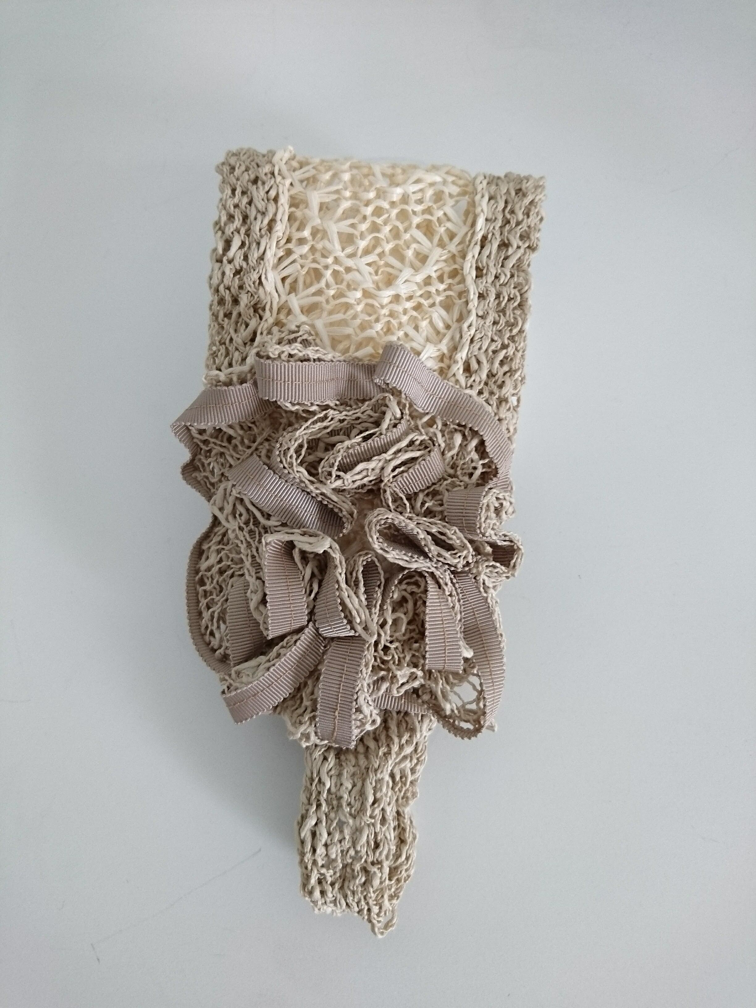 コットンナイロンの糸でお花を編み上げ、縁にグログランリボンを付けて仕上げています。