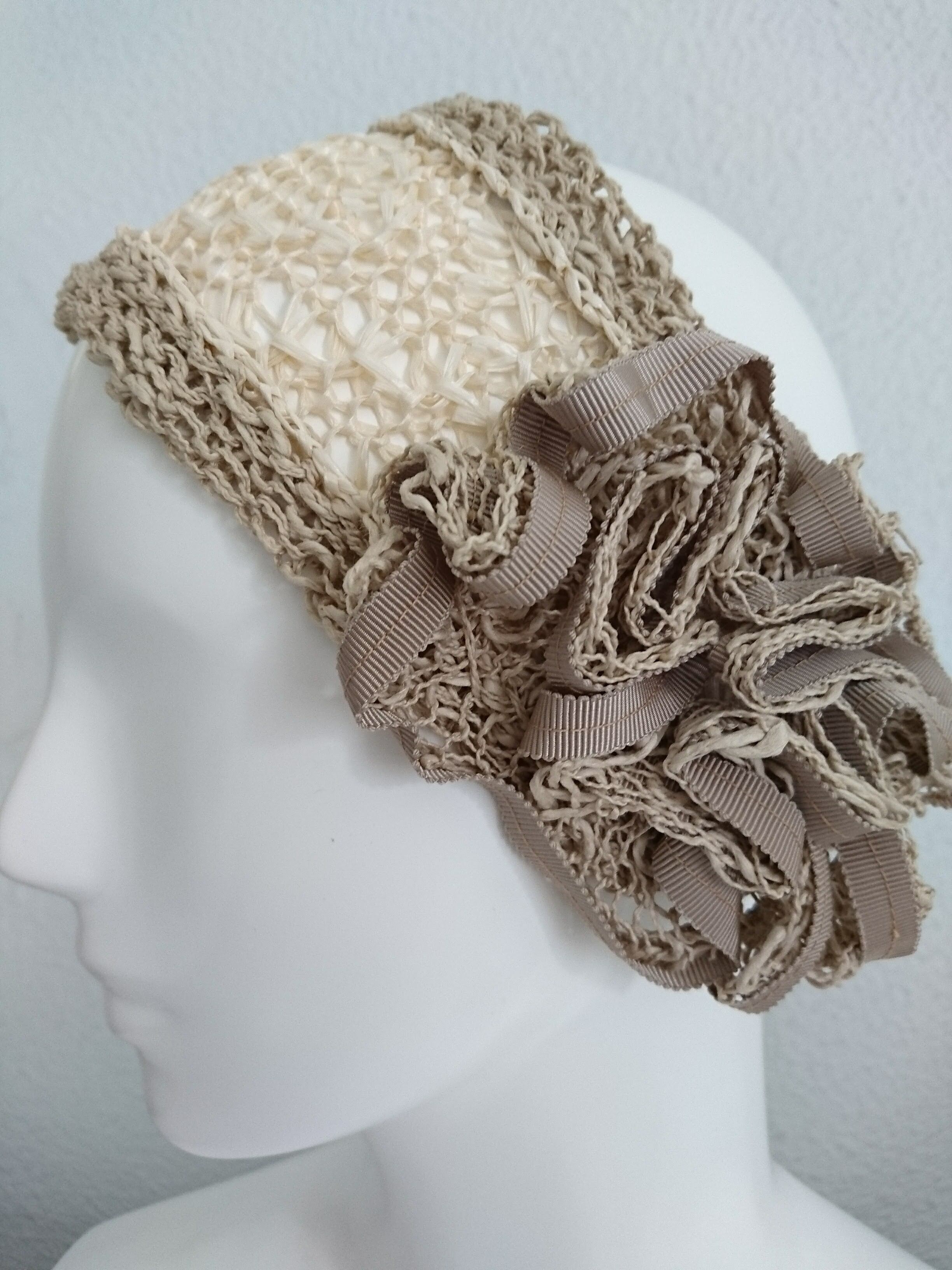 軽いレーヨンラフィアの糸を本体に使い、透かし編みで涼しげです。
