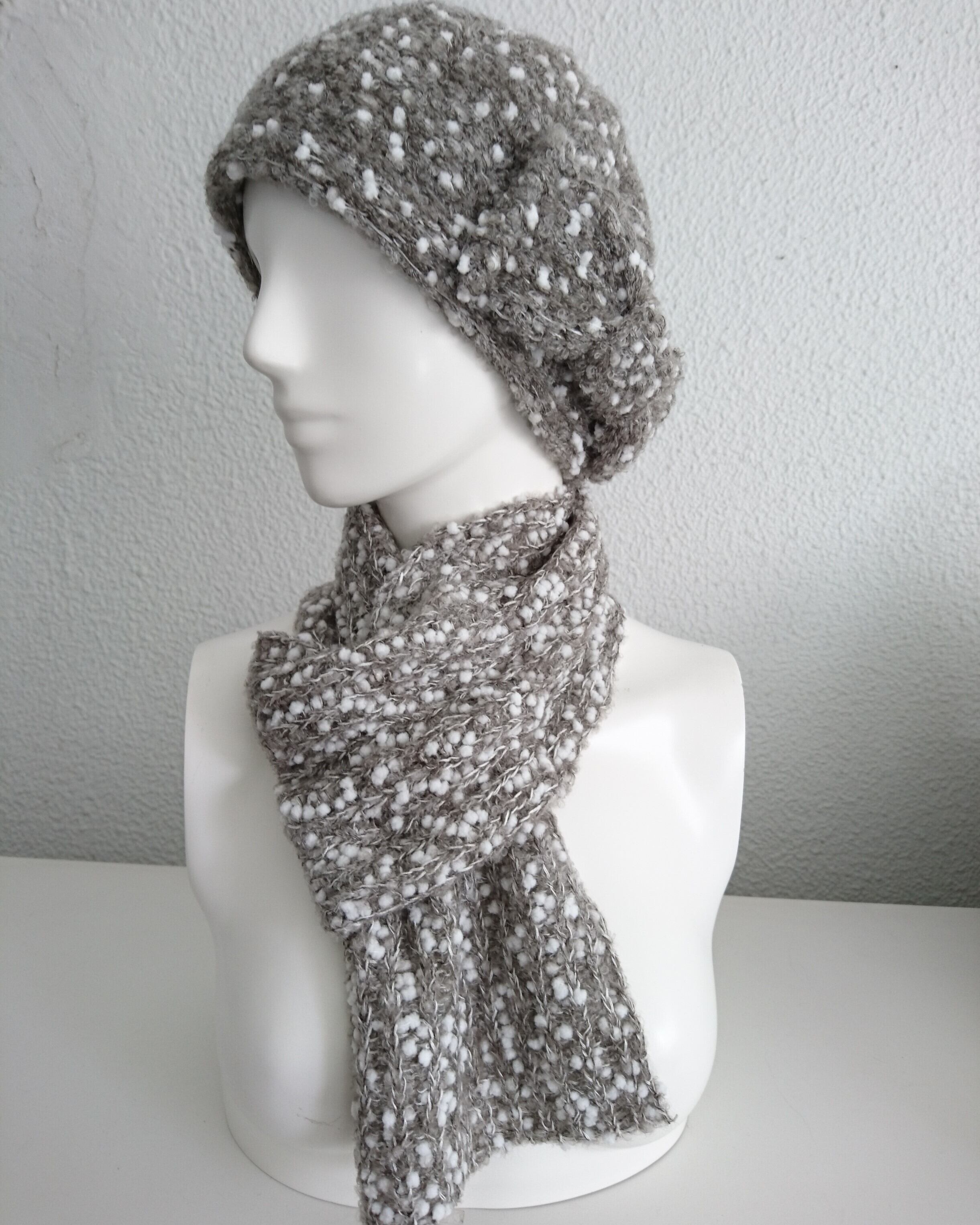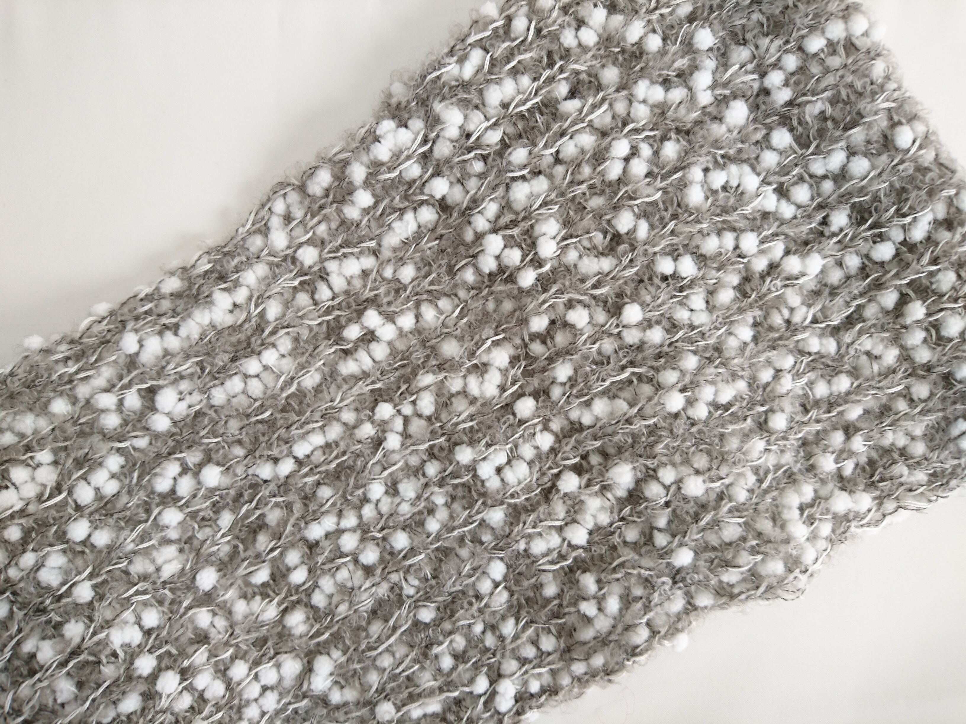 柔らかくてとても軽いループ状の糸とポンポン糸を組み合わせてふんわりと編まれています。編地がお洒落で高級感があります。