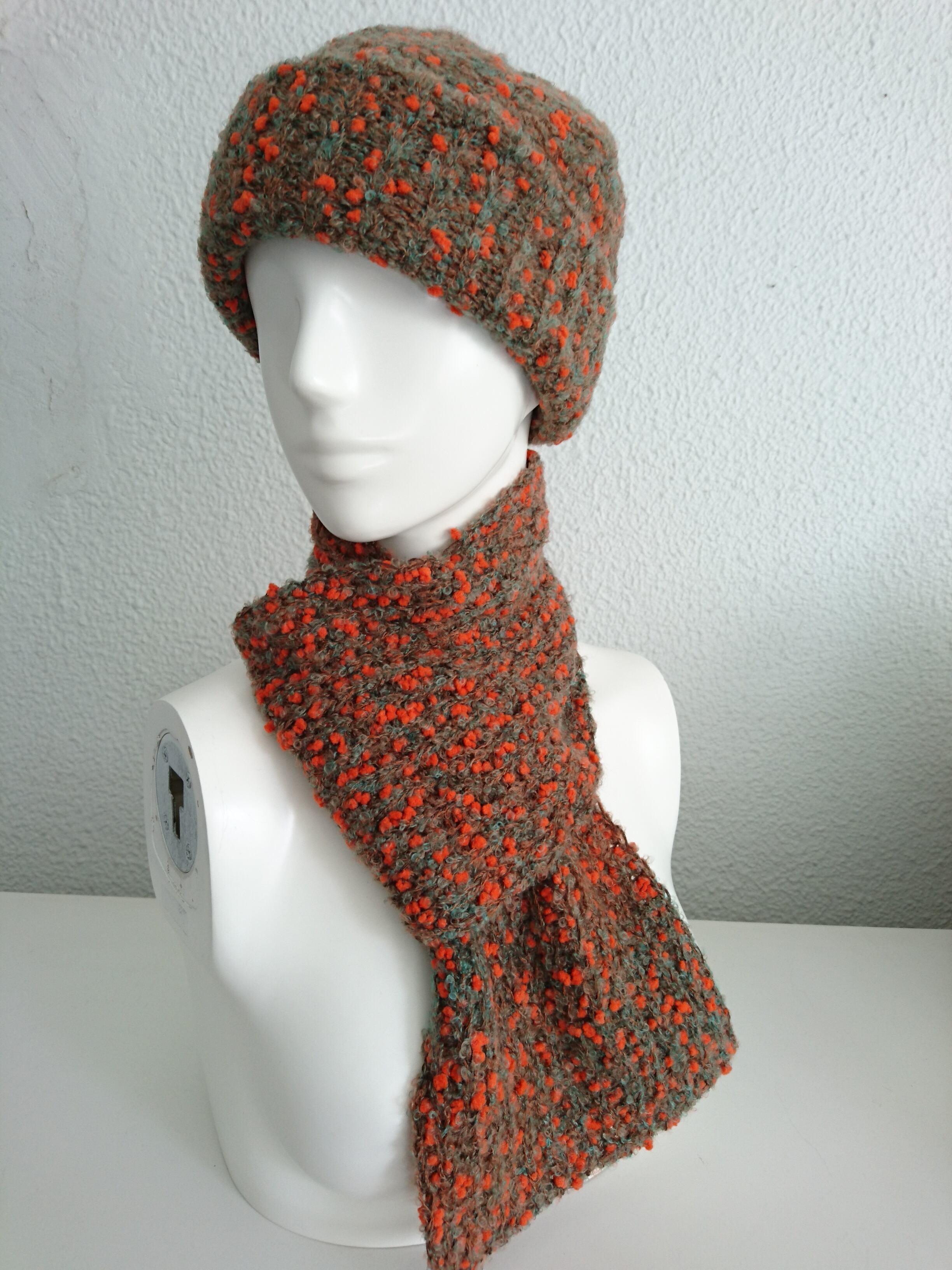 ミニマフラーと同じ素材で編んでいますので、マフラーとセット遣いもできますよ。軽くて柔らかくて、とても暖かく快適です。