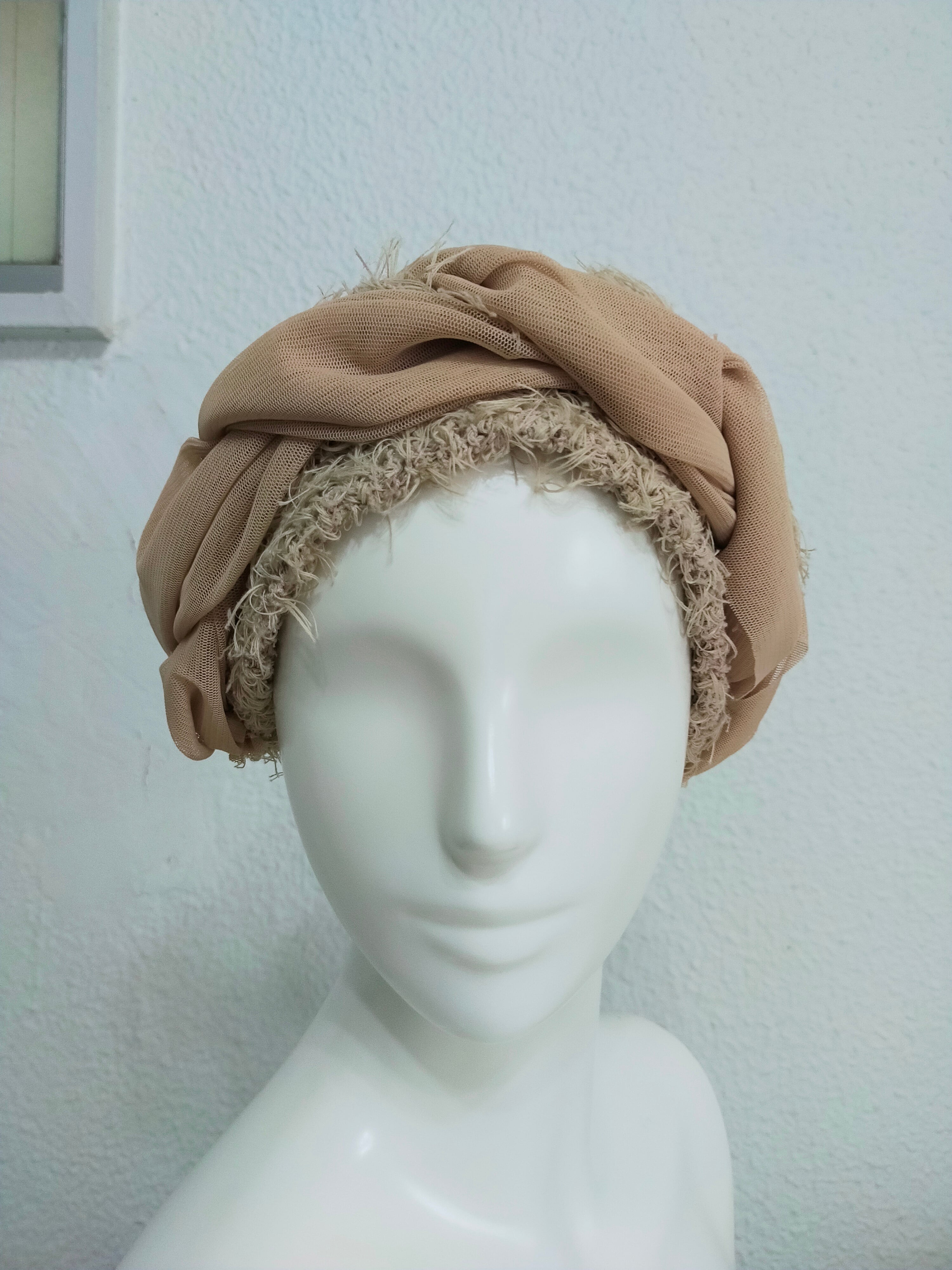 イタリア製のコットンシャギーの糸を本体に使い、チュール素材の三つ編みの飾りをあしらったおしゃれで個性的なヘアーバンドです。
